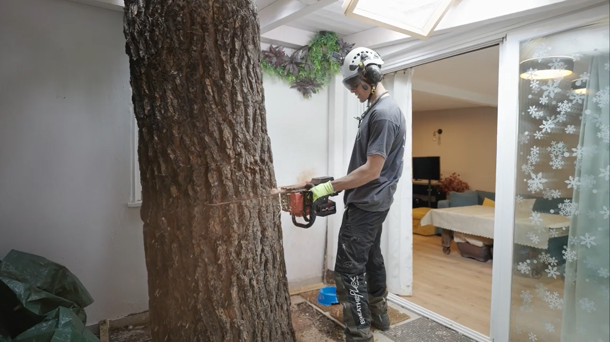 Sėkmingai pašalinus išorines dalis, komanda tęsė darbą iš pastato vidaus. Čia jie pjovė likusius kamieno segmentus, išaugusius per priestatą, dirbdami ankštose erdvėse, kur reikėjo ypatingo tikslumo – kamieną per stogą buvo galima pašalinti palikus vos 2 cm atsargą.