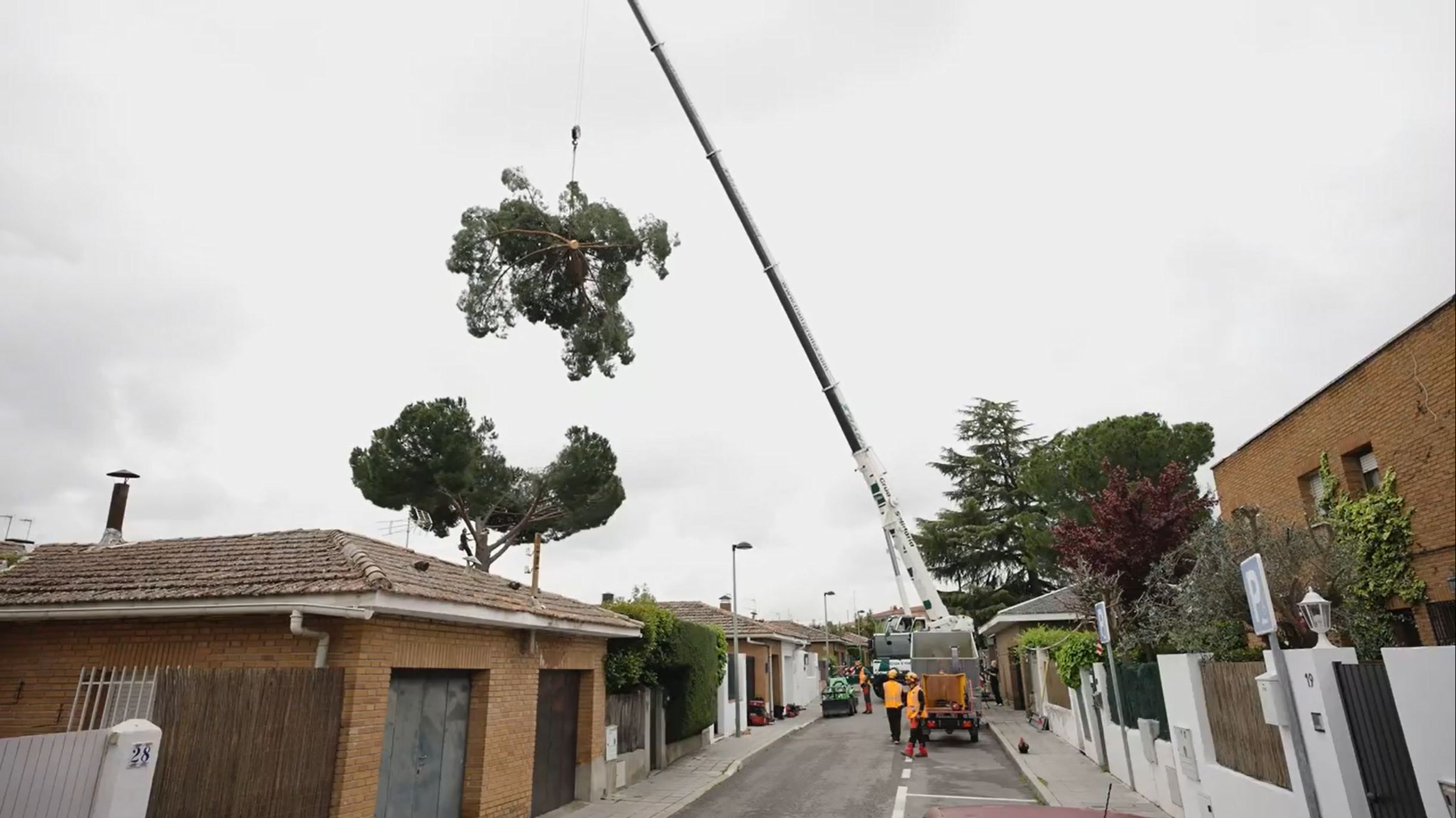 Madrido gyvenamojo namo savininkai susidūrė su rimtu iššūkiu: didžiulis pušies medis augo tiesiai per jų namo vidurį. Medis kėlė grėsmę pastato ir kaimyninių namų stabilumui, todėl reikėjo ieškoti specialistų pagalbos jam pašalinti.